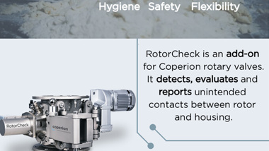 Food manufacturers operate under demanding conditions and have high requirements in regard to hygiene, safety and flexibility. Therefore, they are dependent on reliable equipment which is catered to their needs. RotorCheck 5.0 is an add-on solution for Coperion’s rotary valves which detects, evaluates and reports unintended contact between the rotor and the housing.