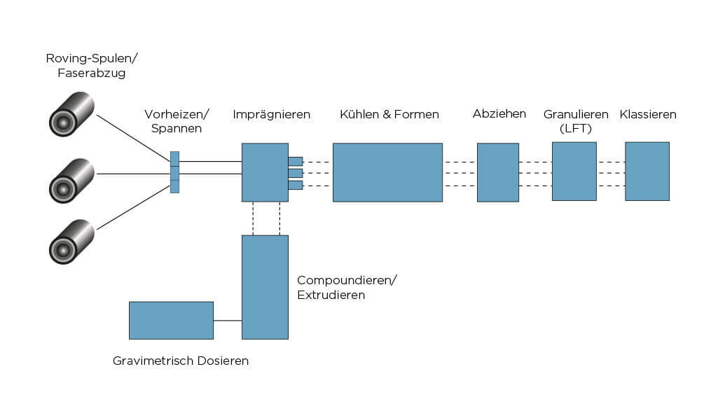 Mit unserem umfassenden technischen Know-how realisieren wir in Zusammenarbeit mit Partnern Systeme für die Herstellung von LFT Langfaserverstärkten Thermoplasten im Pultrusionsverfahren. Die hochpräzisen Dosiergeräte, der Hochleistungs-Doppelschneckenextruder – in dem mittels spezieller Schneckenkonfigurationen die produktschonende Aufbereitung des Polymers und der Additive erfolgt – sowie die LFT-Granulierung und der LFT-Klassierer werden von Coperion und Coperion K-Tron geliefert. Der Pultrusionsimprägnierkopf mit Roving-Spulengatter, der die Imprägnierung der Fasern in den Anlagen übernimmt, sowie weitere Ausrüstungskomponenten stammen von Partnerunternehmen.