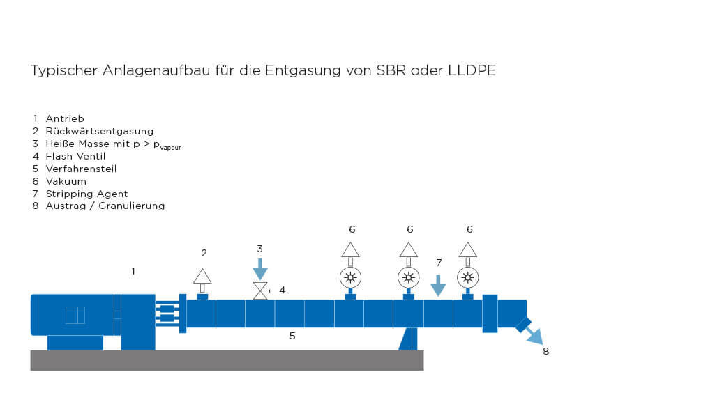 Als Technologieführer für Aufbereitungsprozesse bietet Coperion umfassende, maßgeschneiderte Entgasungslösungen für das Compoundieren und Extrudieren. Diese reichen vom Entgasen von Kunststoffschmelzen über die Kautschukentgasung bis zur Herstellung praktisch geruchsfreier Kunststoffe für Verpackungen oder den Fahrzeuginnenraum. Ob flüchtige Bestandteile in kleinen oder großen Mengen, mit hohem oder niederem Siedepunkt vorliegen - mit der langjährigen Erfahrung aus zahlreichen Projekten, Versuchen, Simulationen und Scale-ups stimmen unsere Spezialisten jeden Doppelschneckenextruder optimal auf Ihre Entgasungsanwendung ab, vom Laborextruder bis zur Hochleistungs-Compoundieranlage.