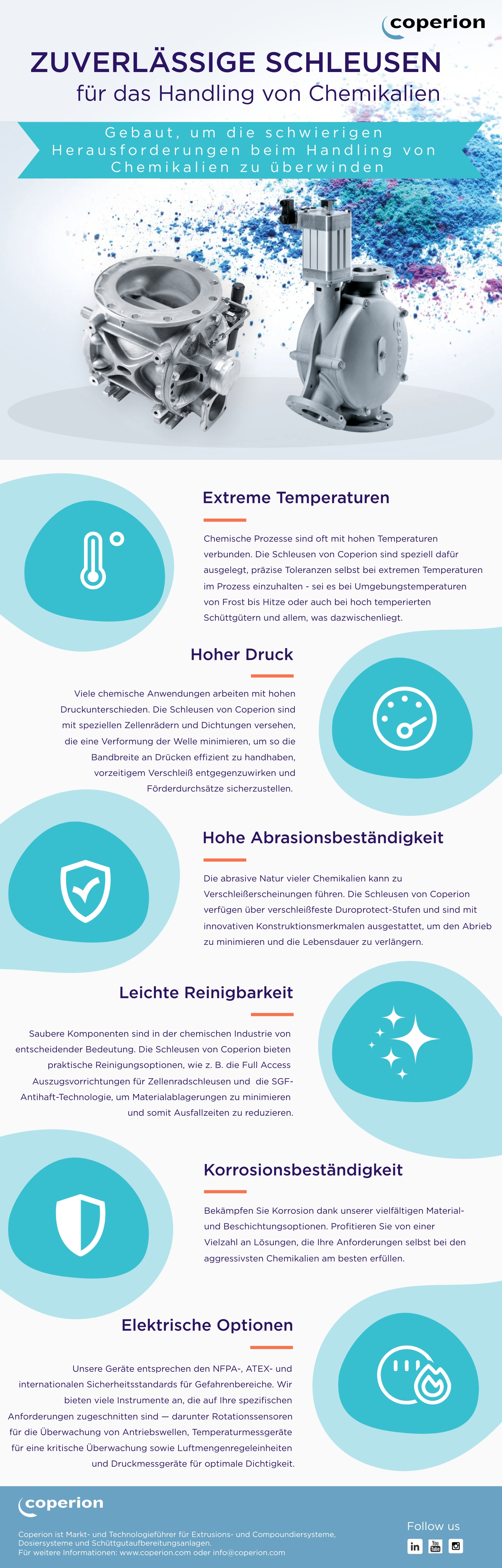 Coperion bietet eine breite Palette an Zellenradschleusen und Weichen, die speziell für die Chemieindustrie entwickelt wurden. Diese sind für das Handling einer Vielzahl von schwer fließenden Materialien konzipiert und stellen eine hohe Produktions- und Prozesszuverlässigkeit sicher - auch in den anspruchsvollsten Umgebungen. Das robuste Design trägt zu einer längeren Lebensdauer und einem reibungslosen Betrieb, sogar bei anspruchsvollen Chemie-Anwendungen, bei. In der folgenden Infografik erfahren Sie mehr über unsere zuverlässigen Schleusen für das Handling von Chemikalien:
