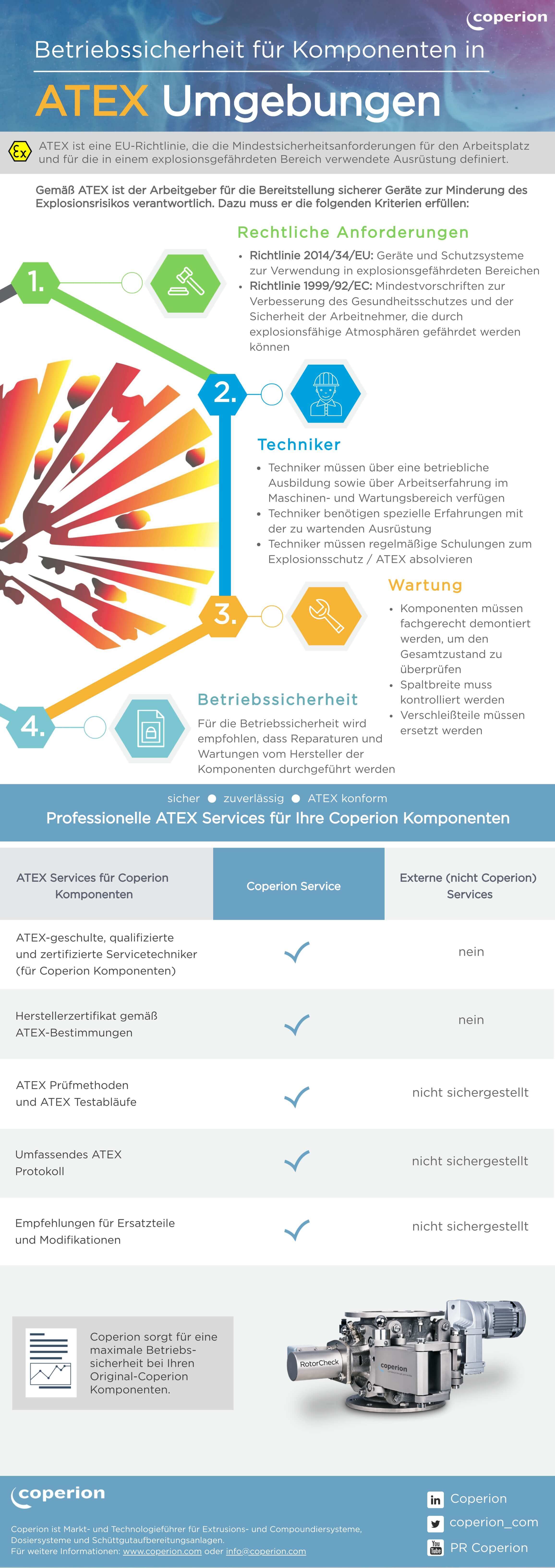 Wir bieten für alle unsere Coperion-Komponenten einen professionellen ATEX-Service an. Unsere qualifizierten Servicetechniker sind umfassend mit allen ATEX-Richtlinien vertraut. Wir kennen jedes Detail unserer Komponenten und sind so in der Lage, Wartungsarbeiten und Reparaturen unter Einhaltung höchster Sicherheitsstandards durchzuführen.