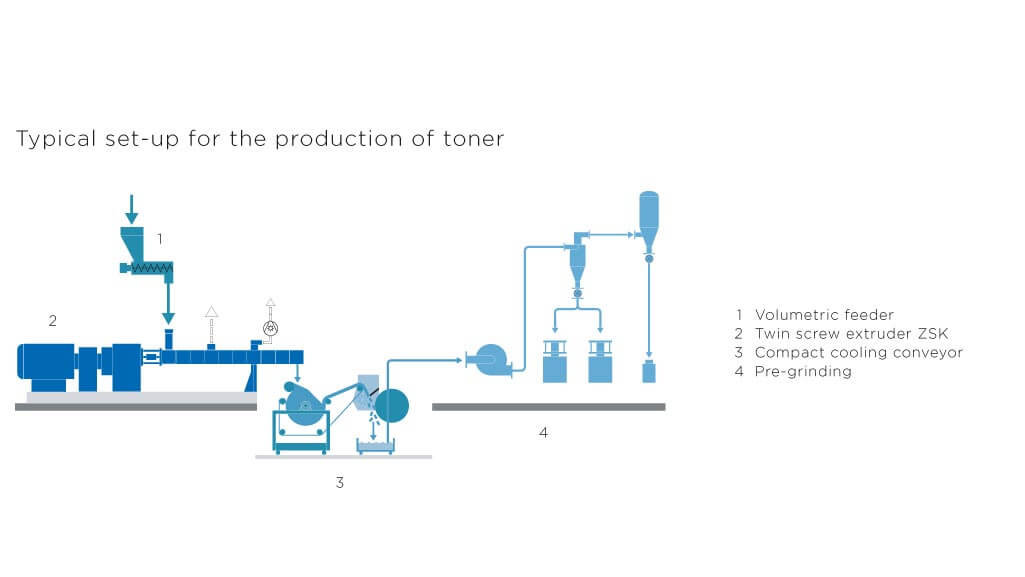 Coperion is longtime expert in the design and implementation of feeding and extrusion systems for high-quality toner. Toner recipes consist of resins, pigments and additives, which need to be handled very gently and at the same time thoroughly mixed.