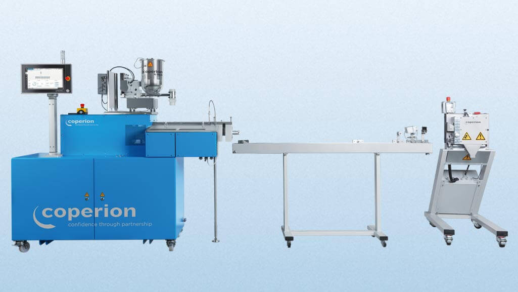 Recently we have built this complete system around a ZSK 18 MEGAlab extruder. The extruder with 18 mm screw diameter achieves throughputs of up to 40 kg/h. It is equipped with a highly accurate gravimetric Coperion K-Tron feeder. The process section of the extruder is followed by a water bath with air wipe type AW51-6 and an SP 50 strand pelletizer from Coperion Pelletizing Technology.