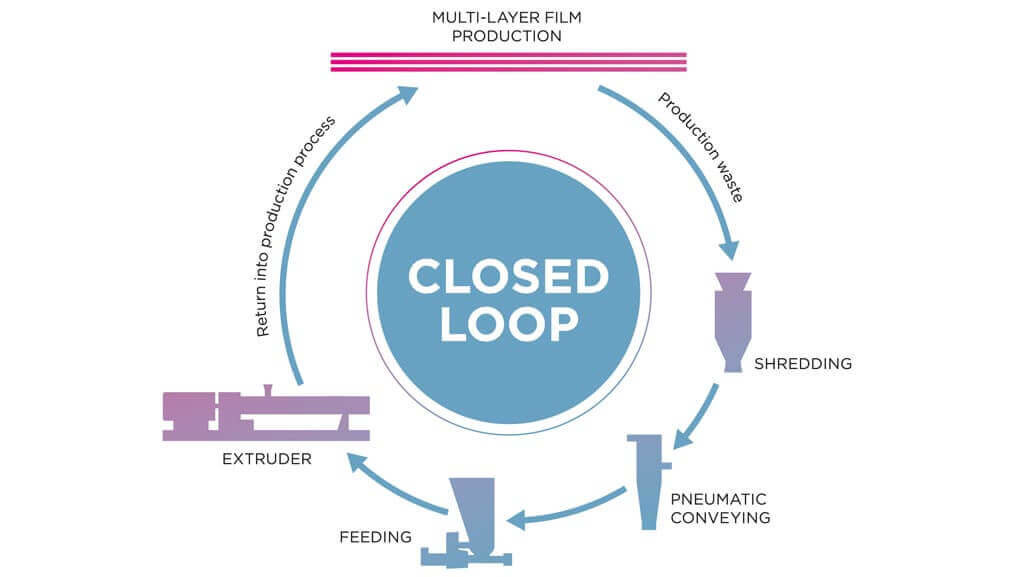 Following homogenization in the ZSK extruder, in the closed-loop concept, the recycled material is added back into the multi-layer film production process; with no quality loss and the proportion of added recyclate is very high. Multi-layer film manufacturing thus takes place sustainably, highly efficiently, and resource-friendly with the aid of advanced technologies.