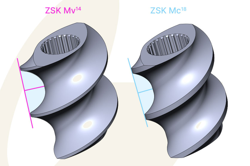 The specific torque of the ZSK Mv series twin screw extruders has been increased to 14 Nm/cm³. With this 24% increase in torque compared to the previous model, the new ZSK Mv¹⁴ extruders achieve a 24% increase in throughput when processing products with high volume and high torque requirements. At the same time, ZSK Mv¹⁴ twin screw extruders ensure improved product quality of the compounds when processing shear-sensitive products.